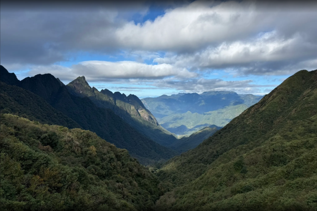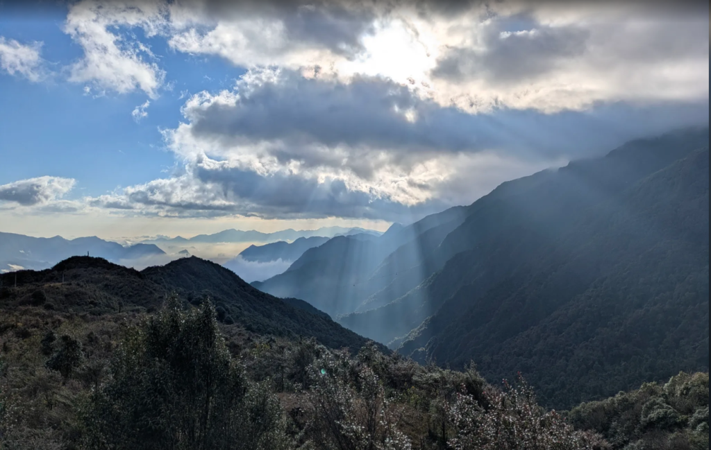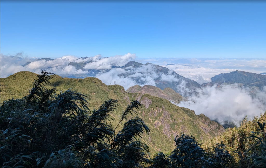 随后展开一段 6–8 小时的高强度徒步,穿越森林、竹林与陡峭山径,最终抵达 海拔 3,143 米的番西邦峰顶。